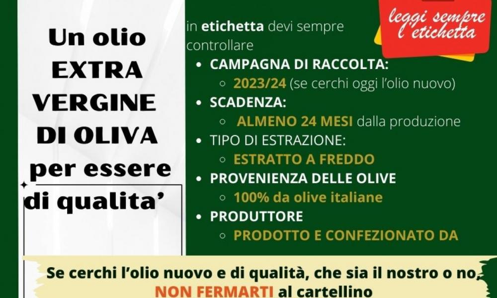 Novembre è il mese dell'olio nuovo e tanti produttori come noi si stanno impegnando per portare sulla tavola dei clienti Oli EVO di qualità che rappresentano al meglio le caratteristiche del territorio in cui operano.Puoi scegliere tra tanti OLI EVO di eccellenza, tra cui, parola dei nostri clienti, anche il nostro.....Saremo contenti se vorrai sceglierci ma lo saremo anche se la tua preferenza andrà ad un'altra realtà come la nostra che ogni giorno si impegna nella valorizzazione e riconoscibilità di questa eccellenza italiana.... Saremo contenti se ogni consumatore sceglierà consapevolmente l'olio da mettere sulla propria tavola e lo avrà fatto dopo aver letto attentamente le info che in etichetta 'testimoniano' la qualità del contenuto.ACQUISTA CONSAPEVOLEMENTE LEGGENDO LE ETICHETTE... ANCHE LE SCRITTE PICCOLE